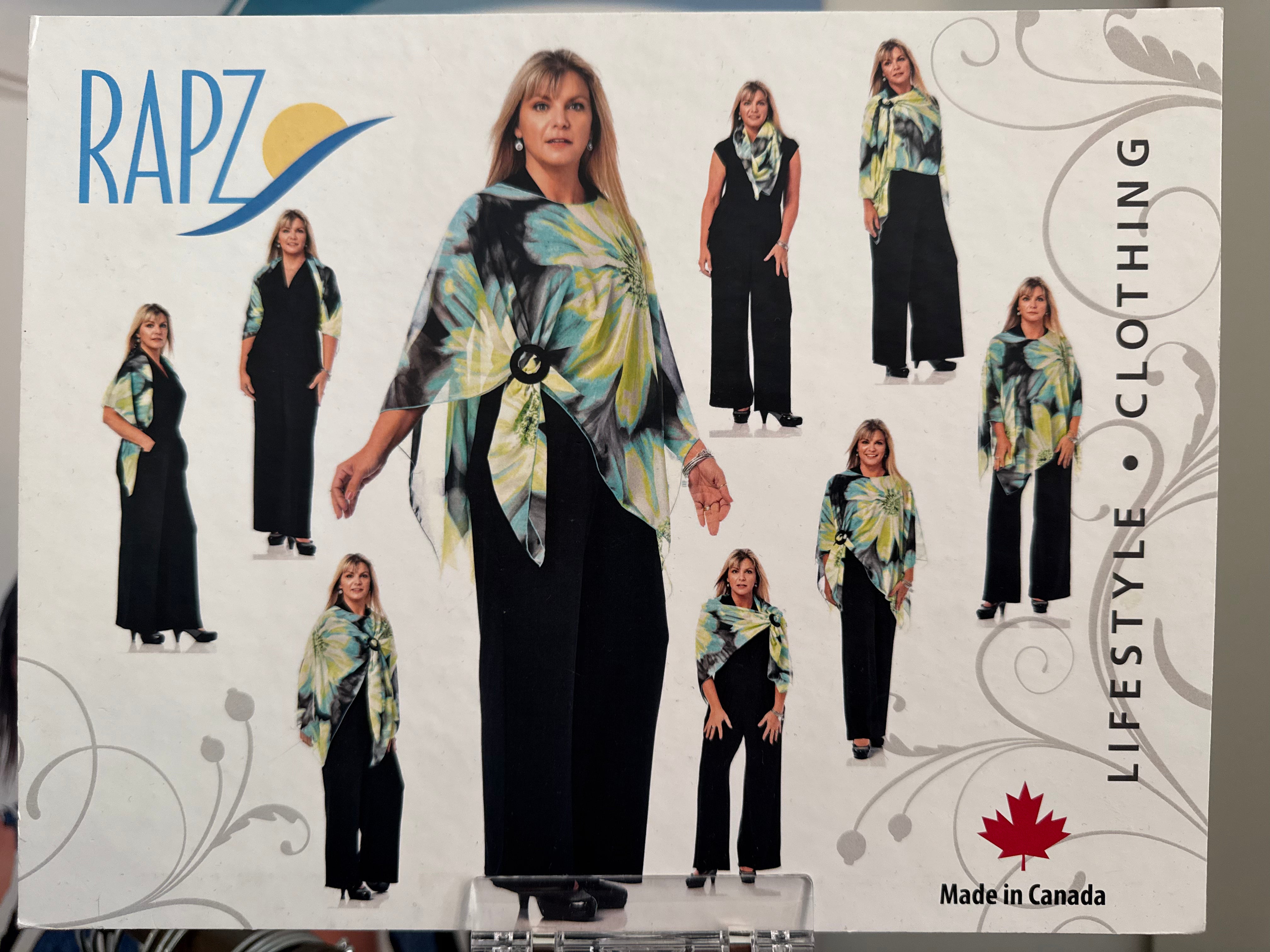 This is one of our most versatile and popular flowing top styles. The fabrics are lightweight, the prints are stunning, and they make any dress or top look incredible. They have a beautiful length and can be styled in over 12 ways that really make you look amazing. These ponchos wash and pack like a dream so they are perfect casual resort wear or lightweight travel wear. Pull one on as a beach cover up over you favourite swimsuit. They can be casual wear and evening wear. Wear them with any of our dresses, skirts, cropped pants, pants or leggings. Add one of our fabulous Rapz buckles to style them in over 12 different ways including as a top, poncho, shawl, scarf, sash, stole and more. Made in Canada by Rapz Lifestyle Clothing.