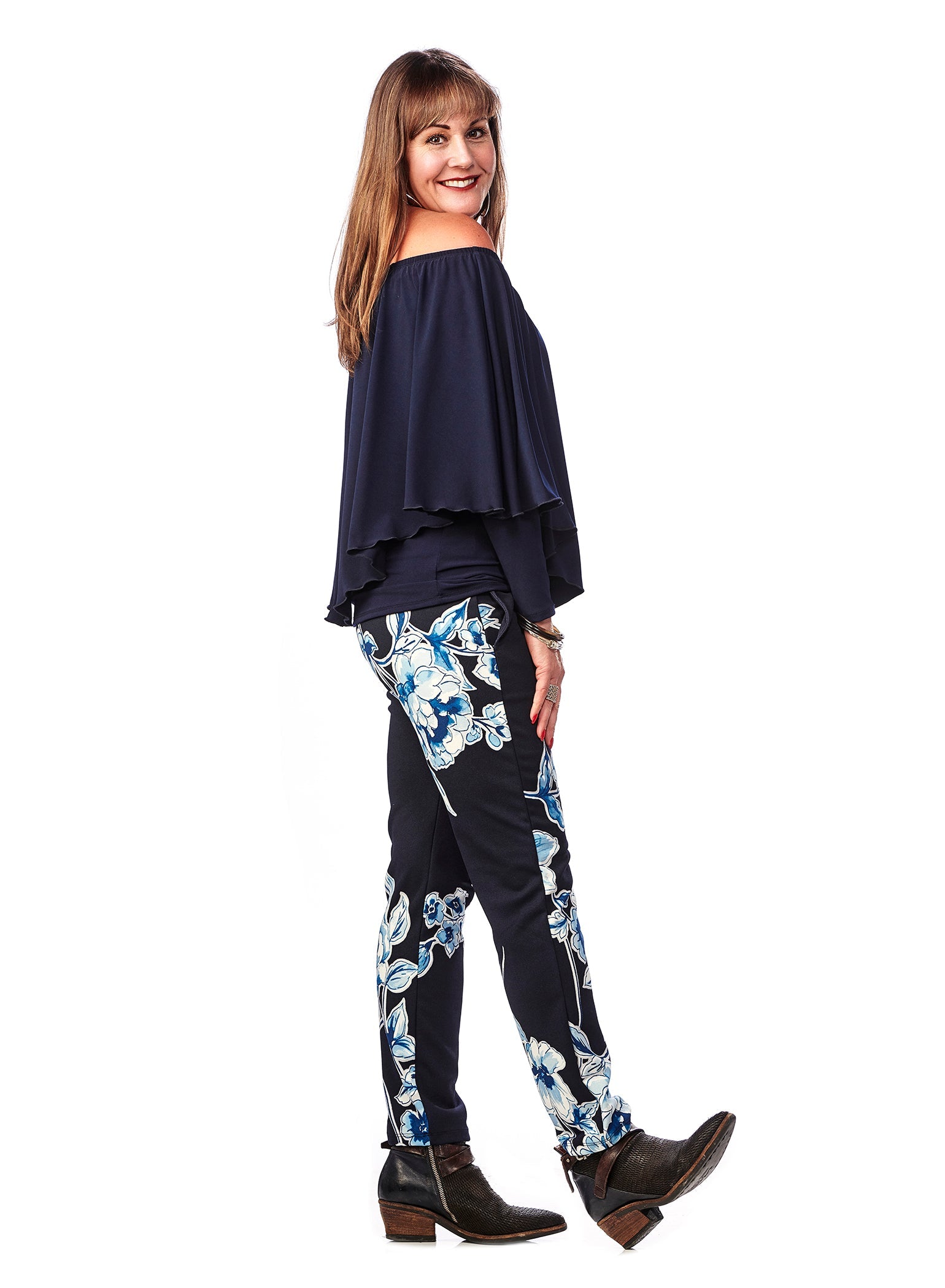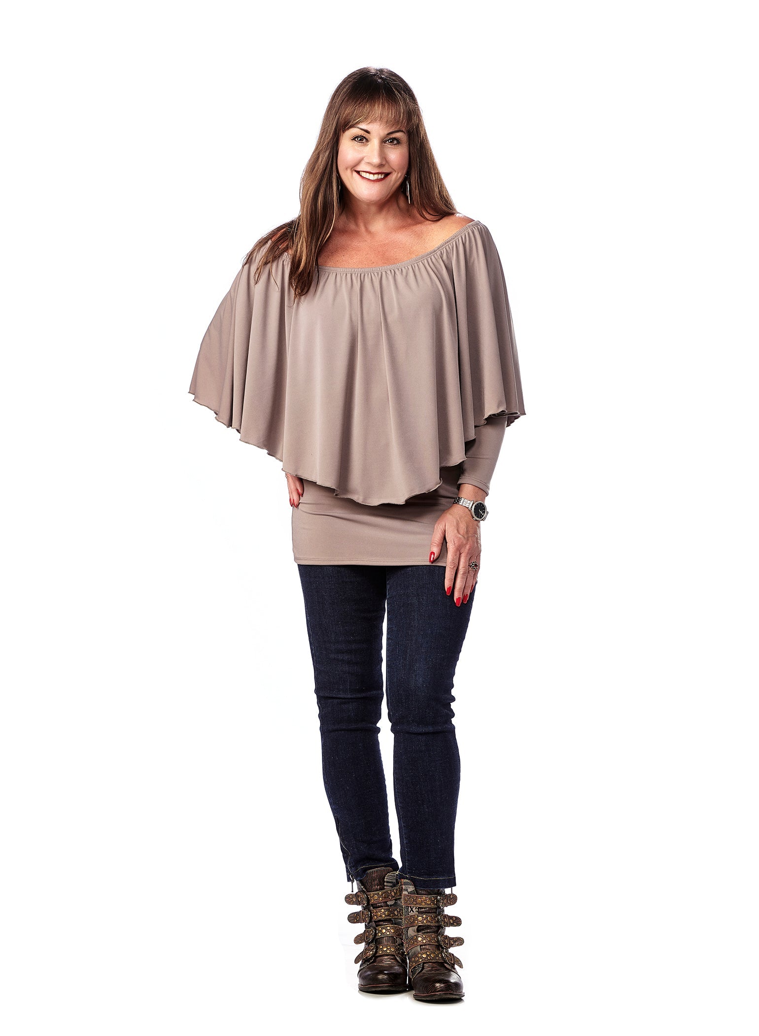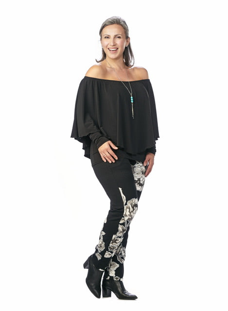 This is a customer favourite. A totally stylish top that will flatter any body. Wonderful sleeves and a choice of neckline. Wear this top with a rounded neck or off the shoulder. Made in Canada.
