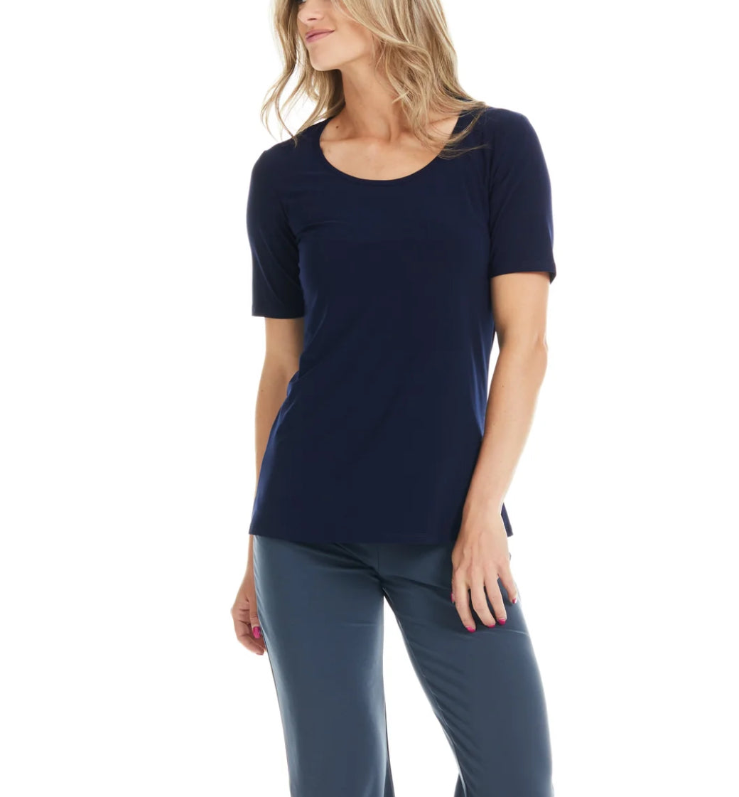 Scoop-Neck Tee - You can never have too many good quality basic essentials for day-today versatile styling. This piece is also breathable enough for utilizing as gym-wear if layered over a sports bra and yoga pants. It is available in a wide variety of colors and patterns for your personal taste.